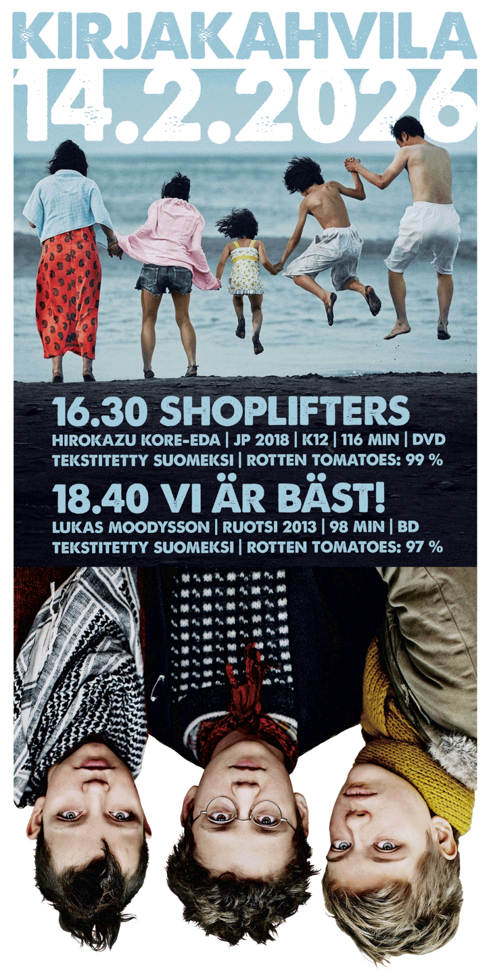 Ystävänpäivänä 2026 Kirjiksessä katsotaan elokuvia köyhyydestä, välittämisestä, varastelusta, yhteisöllisyydestä, ulkopuolisuudesta ja punkbändin perustamisesta.