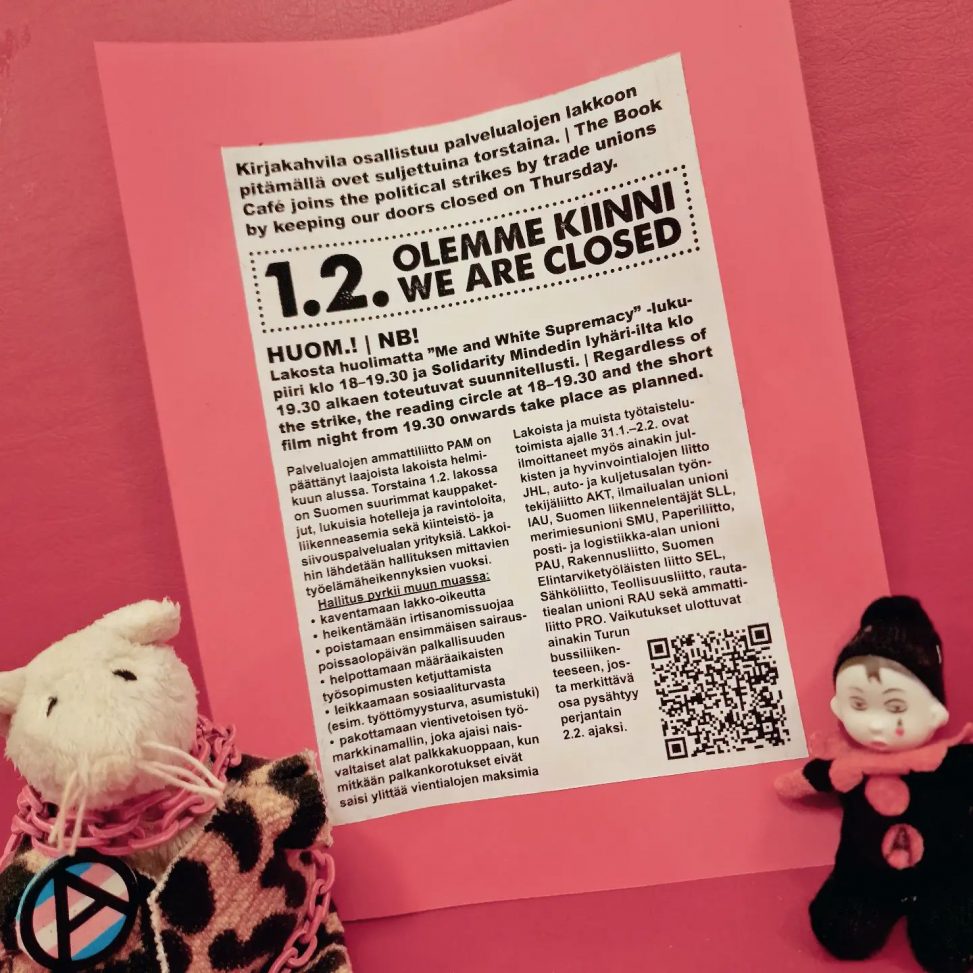 Kirjakahvila osallistuu palvelualojen lakkoon pitämällä ovet suljettuina torstaina 1.2. | The Book Café joins the political strikes by trade unions by keeping our doors closed on Thursday 1 February.