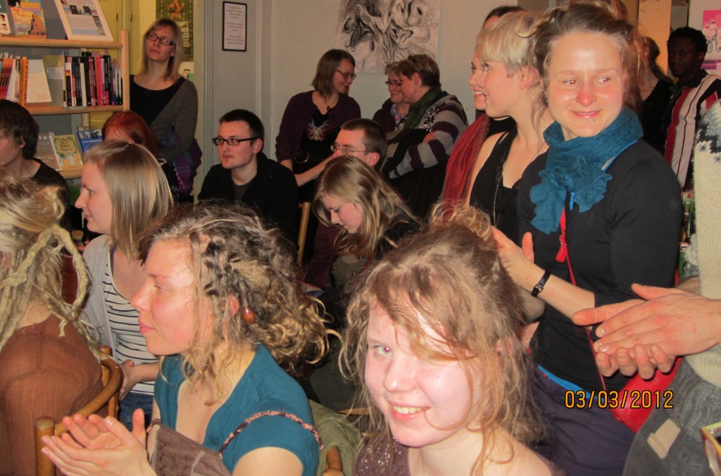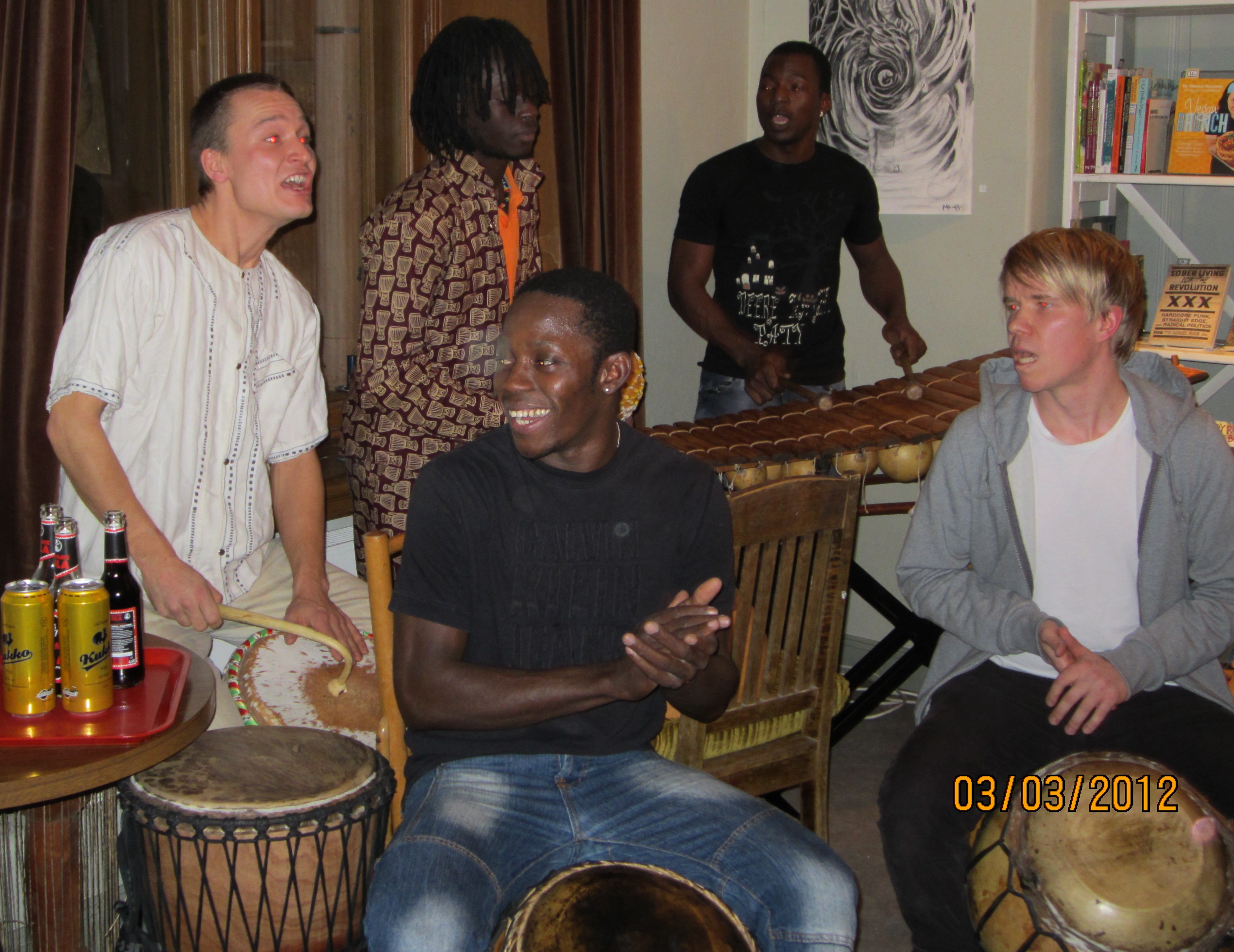 No niin: Kirjakahvila sai ilolla vastaanottaa Fasokanin muusikot viime lauantaina ja tempaistiin yhdessä pystyyn hienot jamit.  Osasimme kyllä odottaa rytmin hurmaa ja hyvää menoa, mutta sitten esiintyjät saapuivat ja ylittivät kaikki odotuksemme.  Balafonit, djembet, dundunit, barat ja pentatoninen laulu suorastaan imaisivat yleisön mukaansa ja tanssahtelevan näkyi myös Kirjakahvilan henkilökunta.