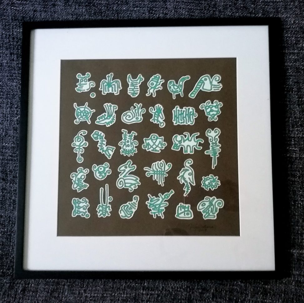 [sekatekniikka; tussi, erikoispigmenttimuste, liima, paperi, osassa töistä konetulosteinen runoteksti]