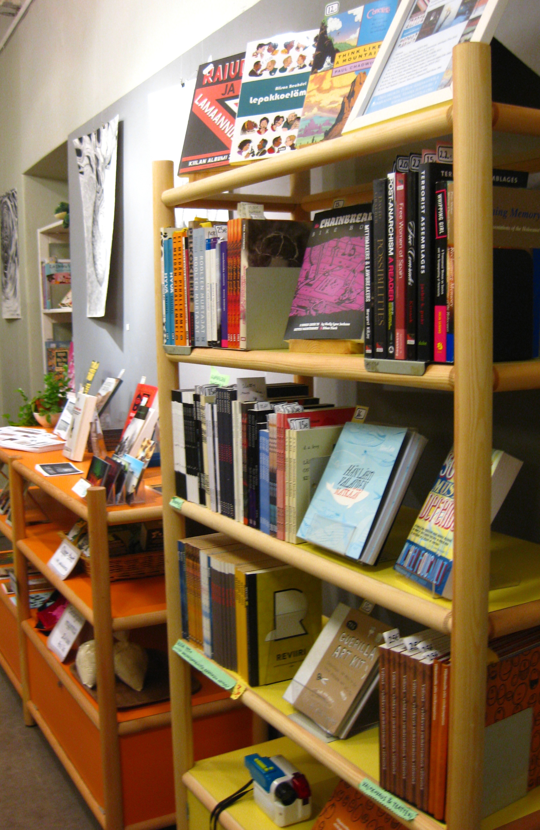 Teokset on valikoitu pienkustantamojen ja järjestöjen tarjonnasta. Hyllyistämme löytyy esimerkiksi hieno valikoima Osuuskunta Vastapainon ja Into Kustannuksen teoksia sekä yksittäisiä helmiä radikaalikustantamoilta kuten Microcosm Publishing, AK Press ja PM Press. Yhteistyössä kanssamme ovat muun muassa riippumaton kirjojen ja lehtien jakelukanava distr@ction, eläinoikeusyhdistys Fauna ry. sekä Nihil Interit -kustantamo.