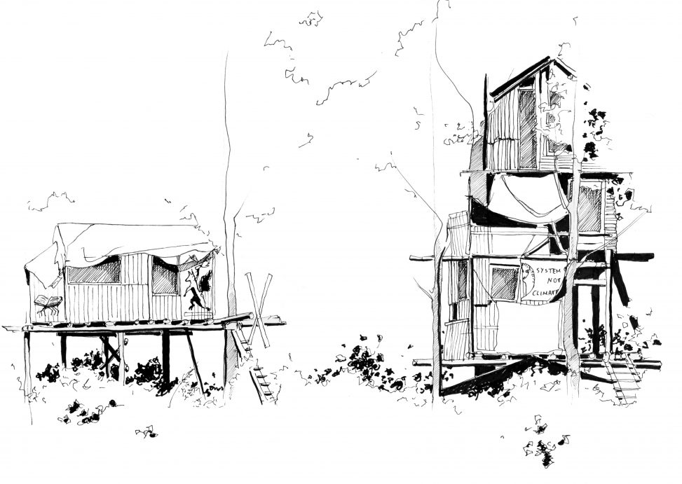 Näyttelyn piirustukset kuvaavat ja dokumentoivat protestileirien arkkitehtuuria. Leirien arkkitehtuuri tekee poliittisesta vastarinnasta näkyvää ja konkreettista: se majoittaa ja suojaa mukana olevia ihmisiä sekä rajaa ja puolustaa vallattua tilaa. Samalla arkkitehtuuri heijastaa ja konkretisoi rakentajiensa arvoja ja toimintatapoja, luoden prefiguratiivista ympäristöä, jossa toisenlaista yhteiskuntaa voidaan elää pienoiskoossa jo tässä hetkessä. Piirustukset ovat osa Heinosen arkkitehtuurin väitöskirjatutkimusta, ja ne on laadittu kolmella eri protestileirillä Keski-Euroopassa vuonna 2022.