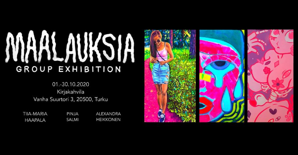 ”Maalauksia” on Kankaanpään taidekoulun opiskelijoiden Alexandra Heikkosen, Pinja Salmen ja Tiia-Maria Haapalan yhteisnäyttely. Esillä on useita värikkäitä maalauksia jokaiselta tekijältä. Avajaiset 1.10. klo 18-20, tervetuloa! Huom, tiloissa on 20 henkilön rajoite koronatilanteen vuoksi!