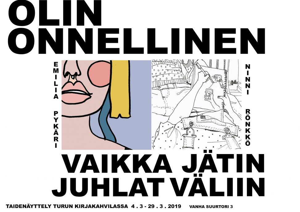 Maaliskuussa (4.3.2019 – 29.3.2019) Kirjakahvilassa esillä oleva Emilia Pykärin ja Ninni Rönkön yhteisnäyttely Olin onnellinen vaikka jätin juhlat väliin on molempien tekijöiden ensimmäinen.
