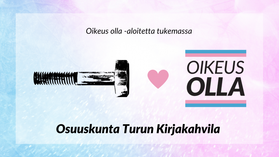 Kirjakahvila tukee Oikeus olla -kansalaisaloitetta. Aloitteella tavoitellaan itsemääräämisoikeuteen perustuvaa translakia, joka kunnioittaa lasten oikeuksia ja Suomea sitovia kansainvälisiä sopimuksia, kuten YK:n Lasten oikeuksien sopimusta ja Euroopan ihmisoikeussopimusta. Aloitteeseen kerätään nimiä 31.5.2021 saakka. Kampanjan nettisivuilta löytyy tarkempia perusteluja, miksi laki on välttämätön, ja aloitteen voi allekirjoittaa kansalaisaloite.fi-sivuilla.