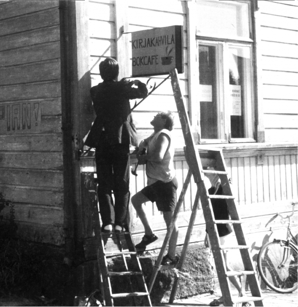 Haluatko tukea Kirjakahvilan toimintaa liittymällä osuuskunnan jäseneksi? Lisätietoja ja jäsenyyslomake löytyvät nettisivujen toiminta-alasivulta. Kuvassa osuuskunnan perustajajäsenet Heikki Lempa ja Topi Ruotsalainen irrottavat Kirjakahvilan kylttiä kahvilan muuttaessa Henrikinkadulta Brinkkalaan vuonna 1985.