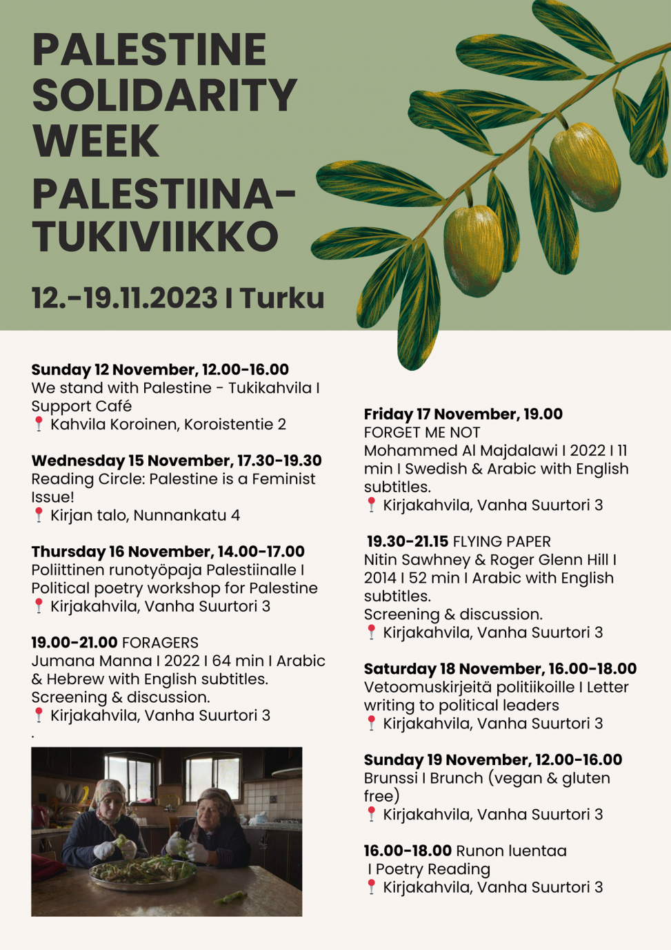 We are also organising a solidarity art sales exhibition that will be take place later after the solidary week. If you want to donate an art piece in support of Palestinian grassroots groups, please be in touch by email: palestine-solidarity at kirjakahvila dot org.