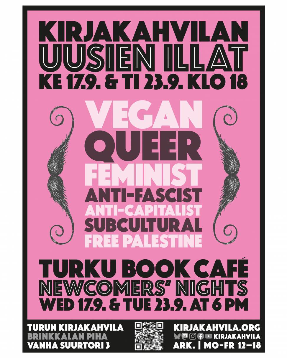 Kirjakahvilan uusien illat ke 17.9. ja ti 23.9. klo 18–19. Tervetuloa kumpaan tahansa kuulemaan pääosin vapaaehtoisvoimin pyörivän 44-vuotiaan antikapitalistisen, antifasistisen ja queerfeministisen vastakulttuuritilamme elämästä ja teoista! // Kirjakahvila’s newcomers’ nights on Wed 17 and Tue 23 September from 6 to 7 pm. Come on either date to hear about the past, present and possible futures of this volunteer- and worker-run anti-capitalist, anti-fascist and queer feminist counter-cultural community space of ours that’s been around for 44 years already!