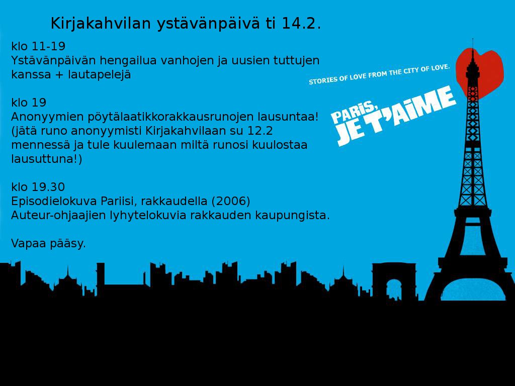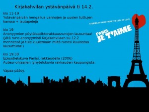 Anonyymit pöytälaatikkorakkausrunot pääsevät ääneen klo 19 siirappisten balladien säestyksellä. Runonlausunnan jälkeen ystävänpäiväleffana näytetään rakkausaiheisia lyhytelokuvia Pariisista (ohjaajia mm. Ethan & Joel Coen, Gus Van Sant, Wes Craven…).